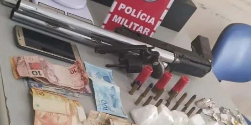 No imóvel que ele estava foram encontrados um revólver calibre 32, uma espingarda artesanal, seis munições calibre 38, Oito munições calibre 32, Três munições calibre 12, um aparelho celular, bijuterias, uma quantidade em dinheiro, além de uma grande quantidade de uma substância branca semelhante à cocaína.