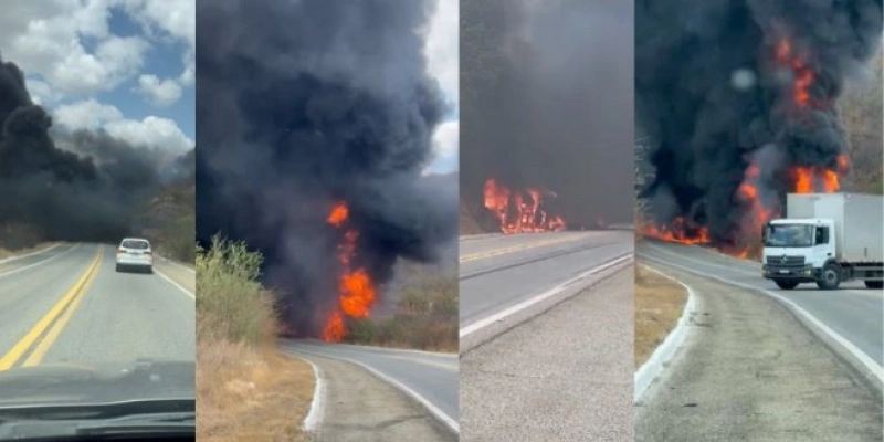 Um caminhão que transportava combustível pegou foto, no final da manhã desta segunda-feira (16), no trecho da BR-230 que fica na Serra de Santa Luzia, no Sertão da Paraíba. Vídeo.