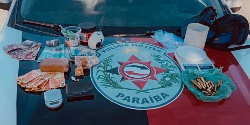 Foram encontrados três pacotes de cocaína, um de crack, 27 munições calibre 38, além de duas balanças de precisão, uma câmera de monitoramento e uma quantia de R$ 1.634.