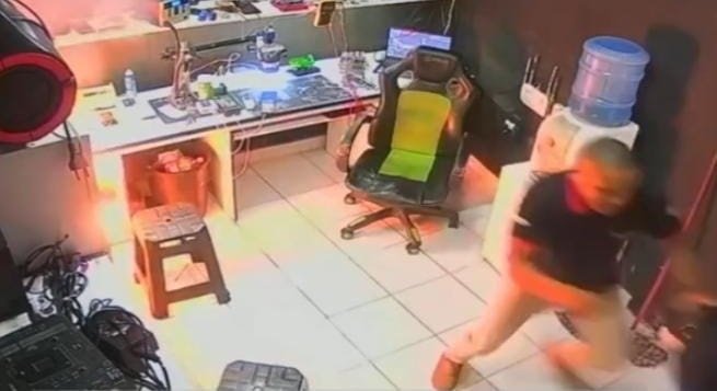 De acordo com as imagens, o aparelho, que apresentava sinais de bateria inchada e havia sido deixado no local para conserto, entrou em combustão repentina enquanto dois homens conversavam no interior da loja. As chamas consumiram parte do ambiente, provocando danos materiais.
